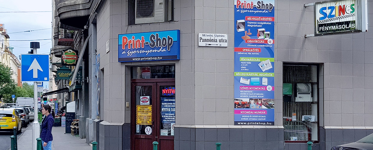 Autóval a Ferdinánd-hídról a Lehel téri templom megkerülésével a Viktor Hugo utcára fordulva a harmadik sarok a Pannónia utca, ahol a körút felé haladva a következő sarkon található a Print Shop.